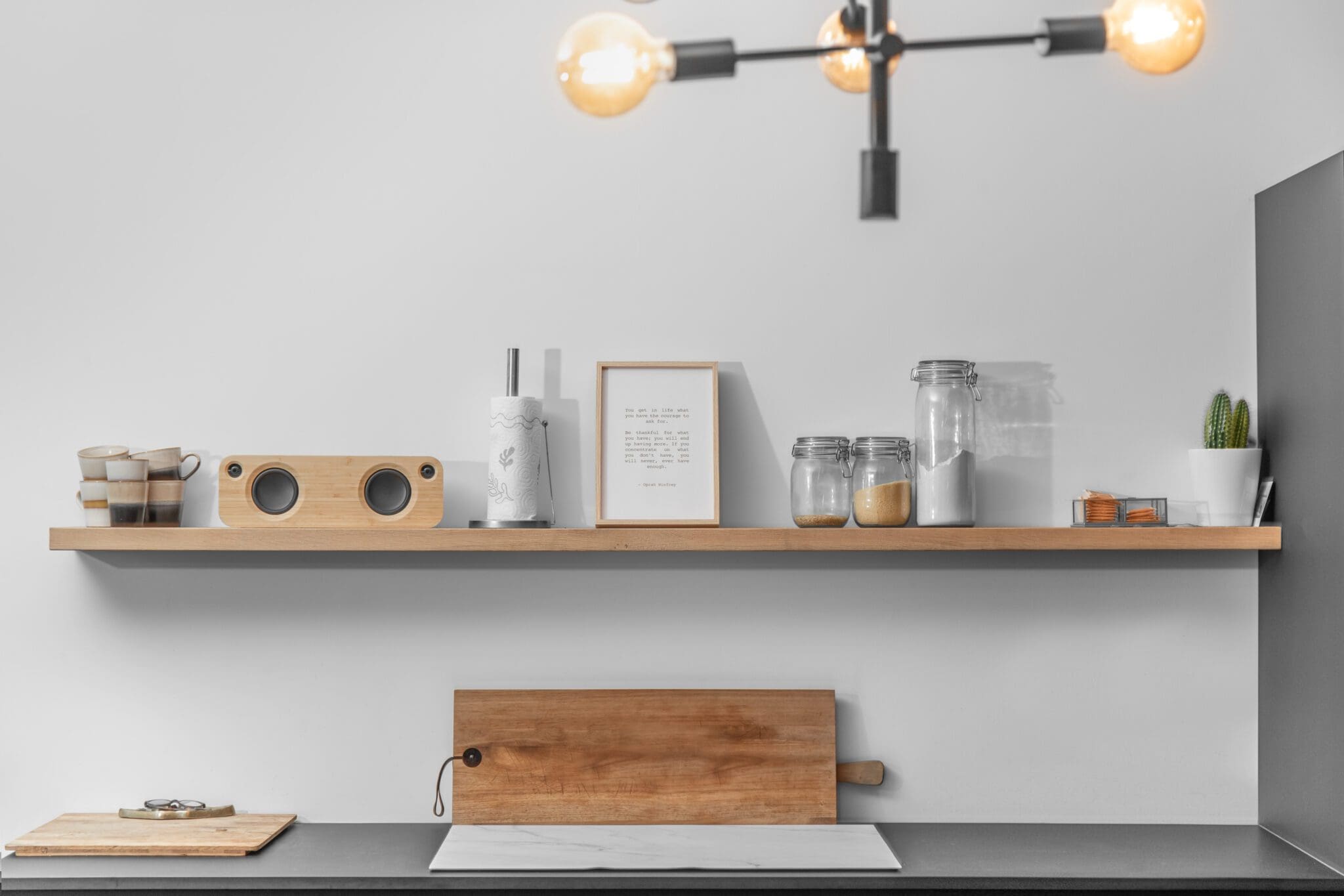 - Dit is een zogeheten ‘zwevende wandplank’. Hierdoor is de ophanging niet zichtbaar, wat een nettere en strakkere look geeft.