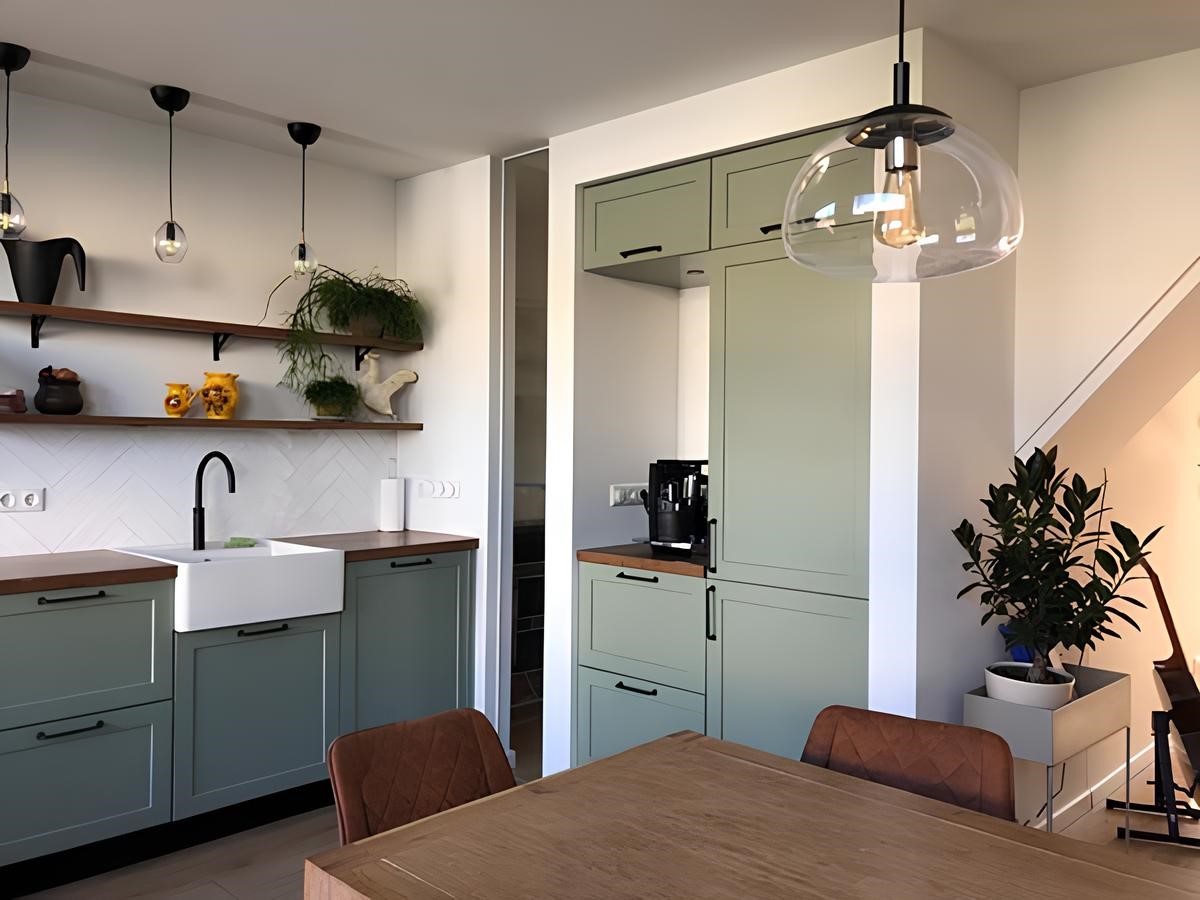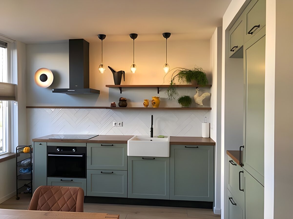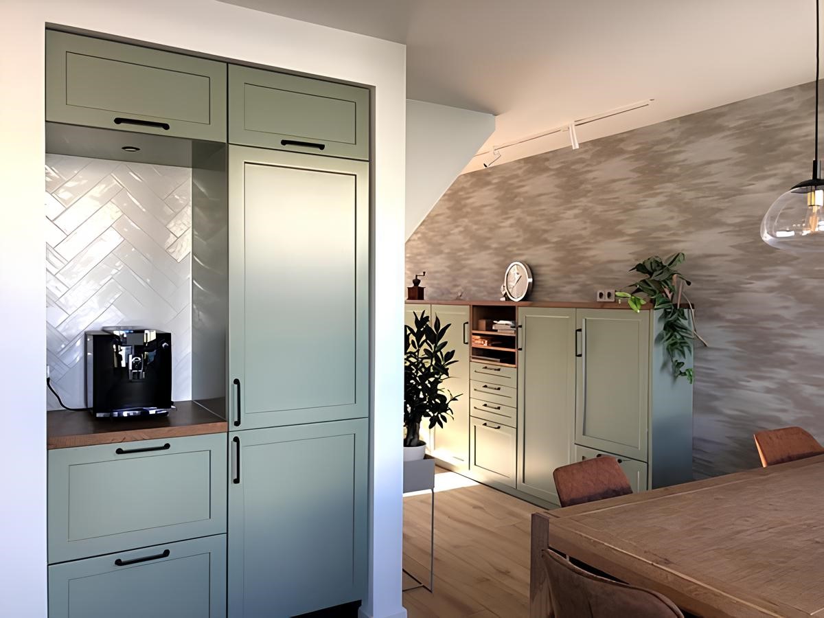 Voor een klant met een duidelijke wens voor een groene keuken hebben we een compleet maatwerkontwerp ontwikkeld. De basis bestaat uit gespoten MDF-fronten met een strakke profilering. Het warme contrast komt van een massief eiken werkblad en eiken wandplanken, waarin we subtiele verlichting hebben ingefreesd. Dit zorgt voor rust, sfeer en een keuken die direct karakter heeft.